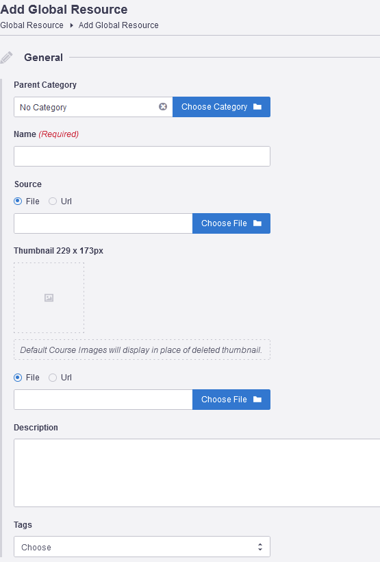 The first of these is adding a Resource to a specific Course. Resources can be added to both Online or Instructor Led Courses, or to a Curriculum. The other option is to upload Resources that can be used for an Course in the LMS, called Global Resources. These can be uploaded through the Global Resources page in the Admin Interface.