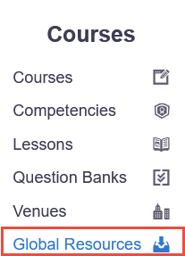 Global Resources are uploaded to the LMS instead of a specific Course. By default, they can be accessed by all signed-in users of the LMS unless specific availability rules are set up for those Resources. They can be organized using Resource Categories, which are an optional way to organize Resources in the LMS.