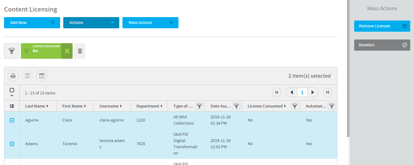 You can find information about which of your learners have consumed licenses by filtering the Content Licensing report. Licenses can be unassigned at any time prior the license being consumed or tied to that user's account.