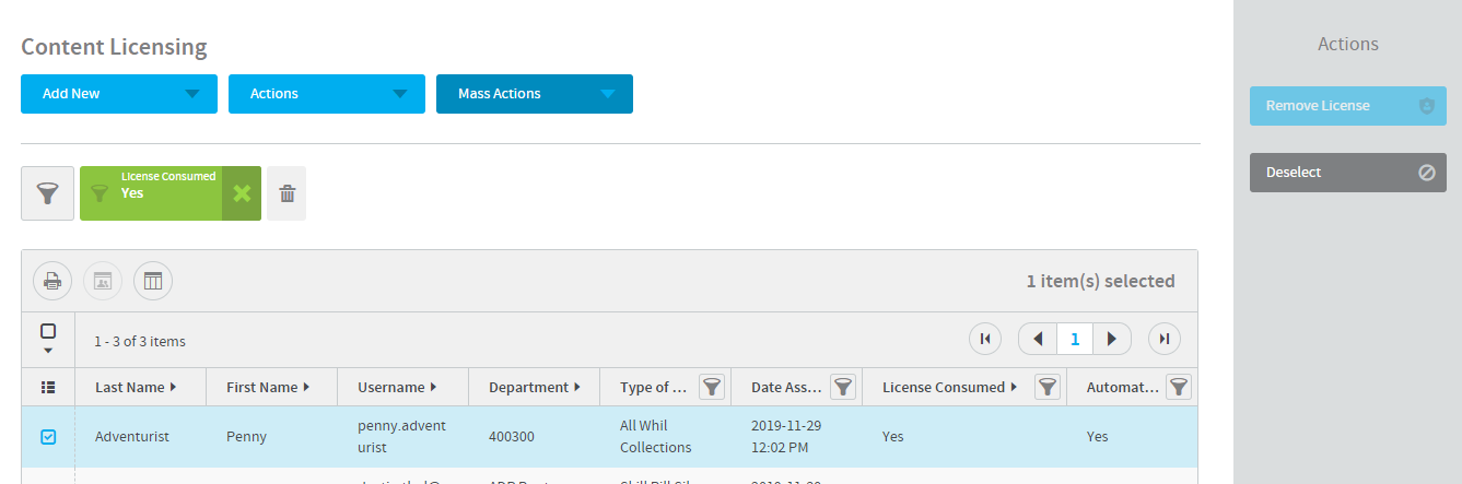 Note: If there is a Yes populated in the License Consumed column of the Content Licensing report, the Remove License option will not be available to select.