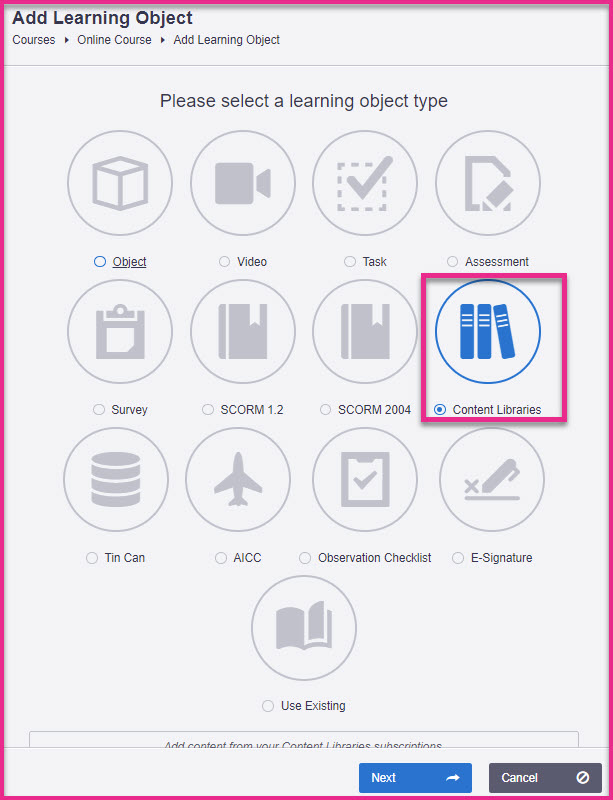 Add Content Libraries learning object type to online course syllabus