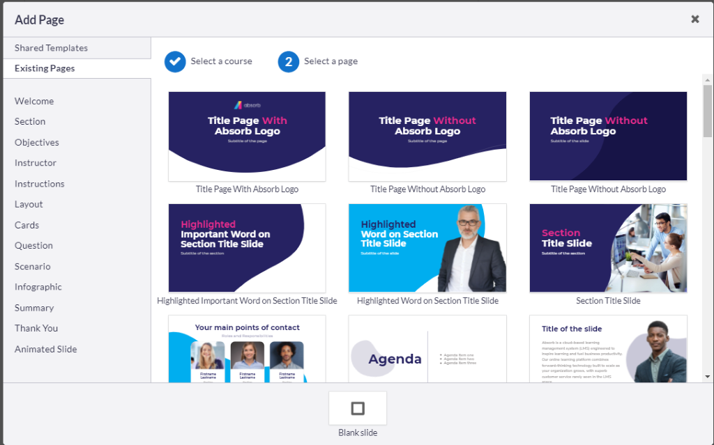 Use the Blank Slide option to add templates for timed slides, knowledge checks, and any other slides where uniform settings and behavior will reduce the workload.