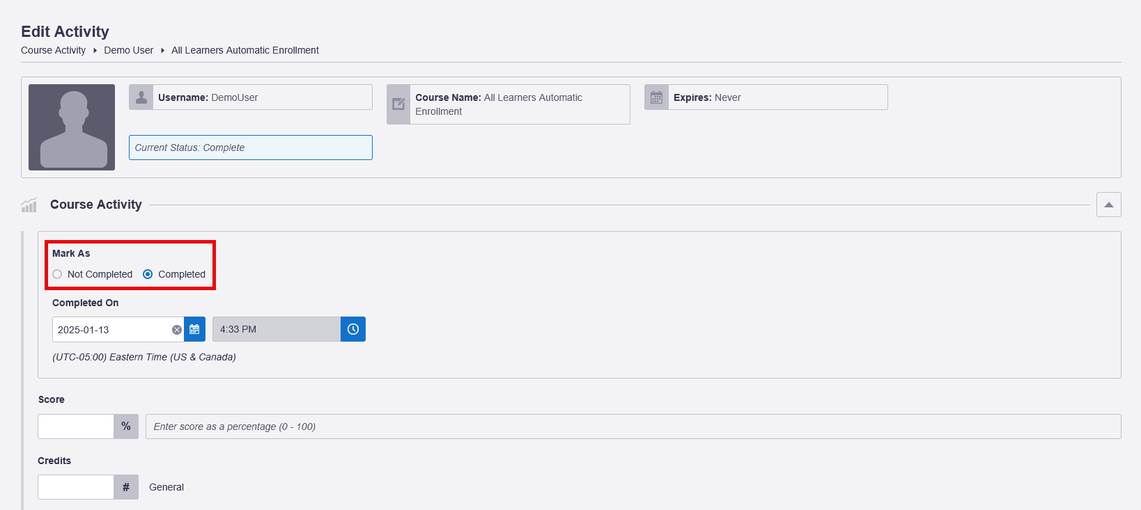 | Completed | Marks a Learner as completed for the class marked in the Mark Attendance page, defaults to a score of 100%. |